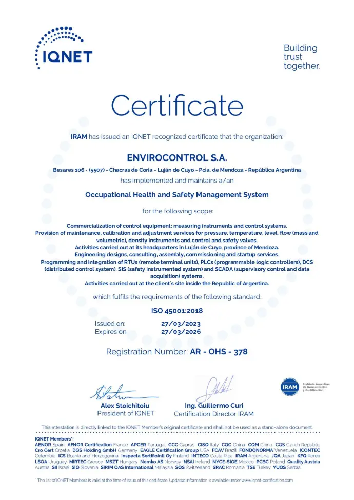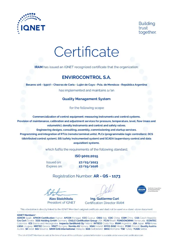 Marketing of control equipment: measuring instruments and control systems. Provision of maintenance, calibration, and adjustment services for pressure, temperature, level, flow (mass and volumetric), density instruments, and control and safety valves. Engineering design, consulting, assembly, commissioning, and start-up. Programming and integration of RTUs, PLCs, DCS, SIS, and SCADA.