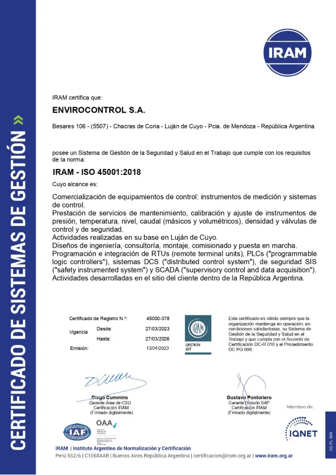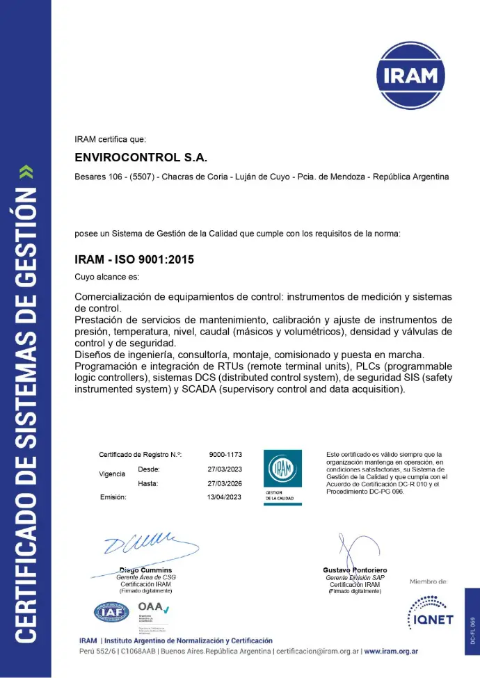 Marketing of control equipment: measuring instruments and control systems. Provision of maintenance, calibration, and adjustment services for pressure, temperature, level, flow (mass and volumetric), density instruments, and control and safety valves. Engineering design, consulting, assembly, commissioning, and start-up. Programming and integration of RTUs, PLCs, DCS, SIS, and SCADA.